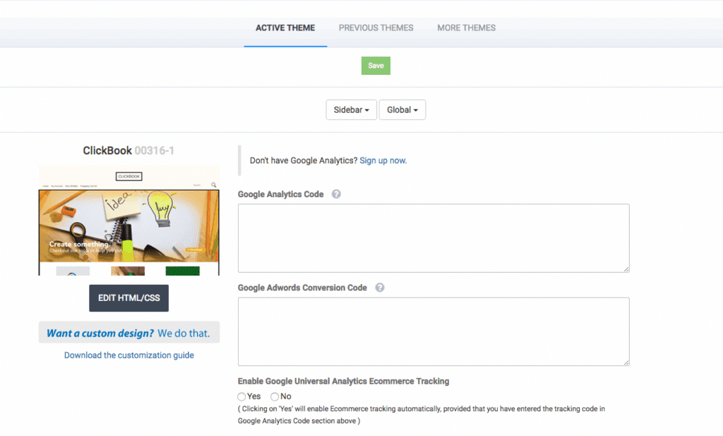 - Click on the Google Analytics tab in the menu list and you can input your GA code here.