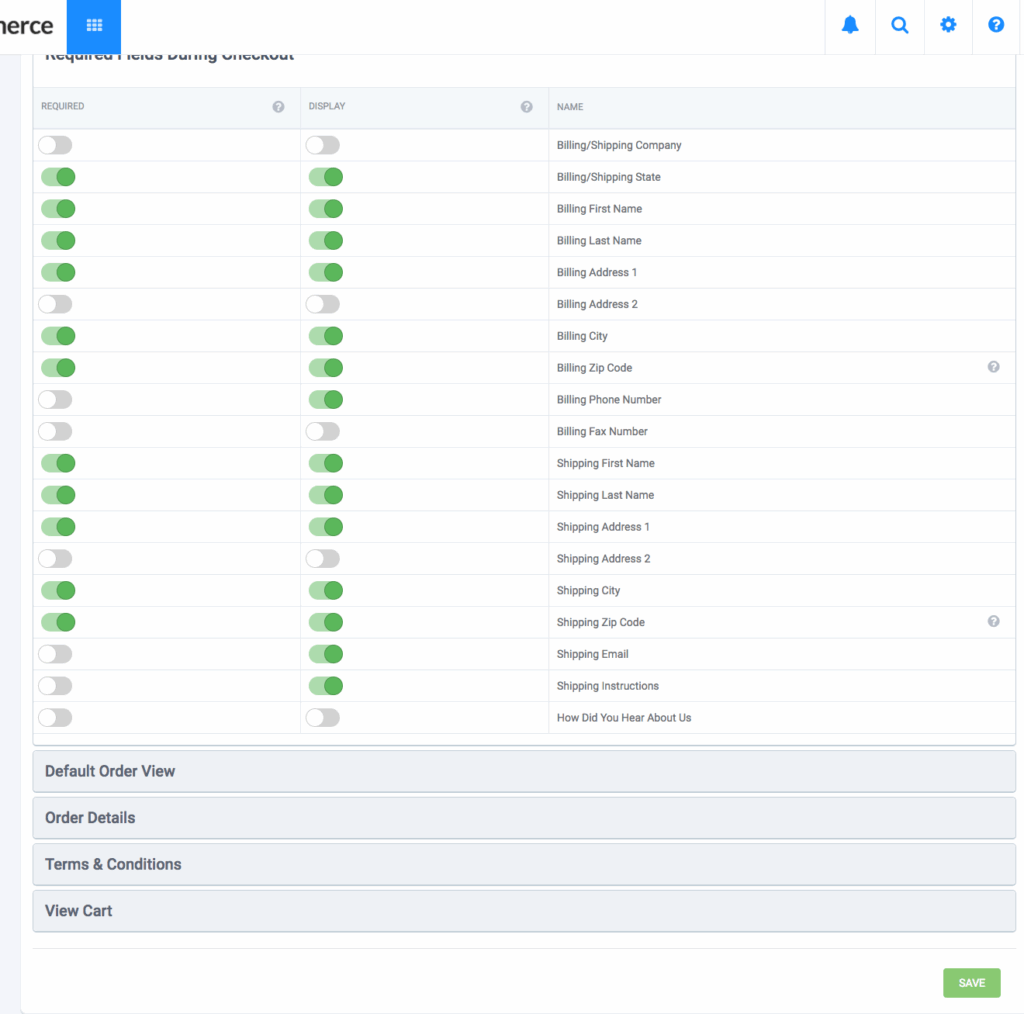 • Note: Any fields that are set to “Required” must also be set to “Display,” or else the customer will get an error when they try to check out.