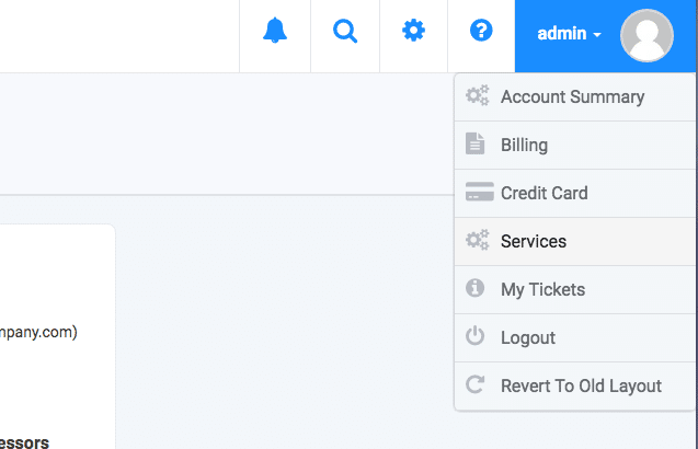 - From the admin panel, hover over your Username (Account) and click on Services.