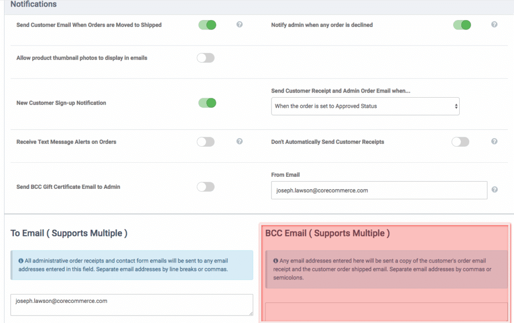 - In this field, you can enter multiple email addresses. If you enter an email address in this field, that email address will receive a copy of the customer order receipt and order shipped receipt. Make sure to click Save when done.