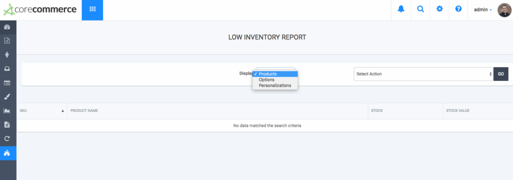 • The report will show a list of all your products with low inventory. If you are tracking inventory by variants (options or personalizations), you can change “Display” at the top of the screen to see low inventory for your variants.